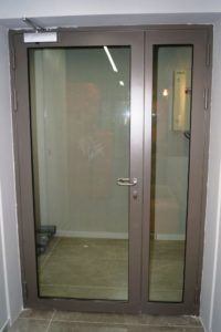 В зависимости от типа используемого материала обычно применяются металлические противопожарные двери, но также и могут быть с остеклением.